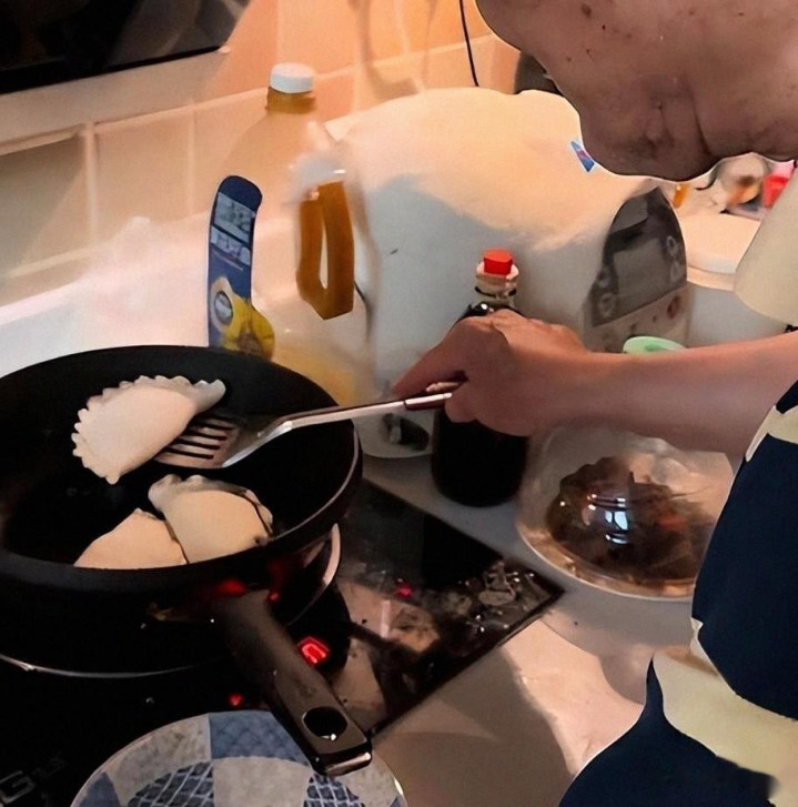 视频里,他在厨房和面、调馅,煎韭菜盒子,手脚利索得不像九十岁